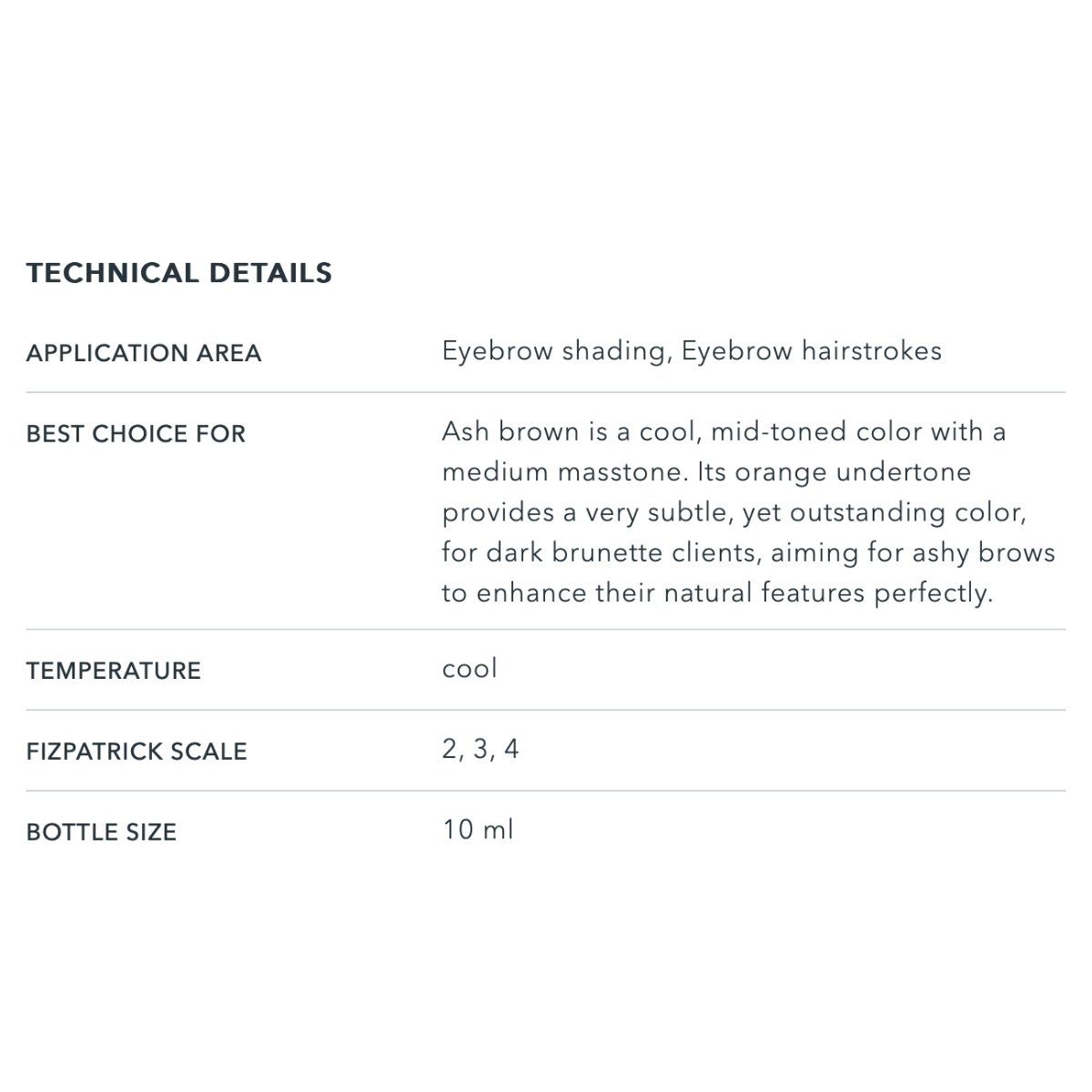 Pigment Ash Brown - AMIEA EVO 2 to doskonały wybór dla osób, które preferują chłodne odcienie brązu w makijażu permanentnym brwi. Jego neutralno-popielata tonacja świetnie sprawdza się u klientek o chłodnym typie urody oraz u osób z jasnobrązowymi lub ciemnoblond włosami. Formuła niemieckiej marki AMIEA zapewnia intensywność, trwałość i stabilność koloru, eliminując ryzyko przebarwień w niepożądane odcienie.