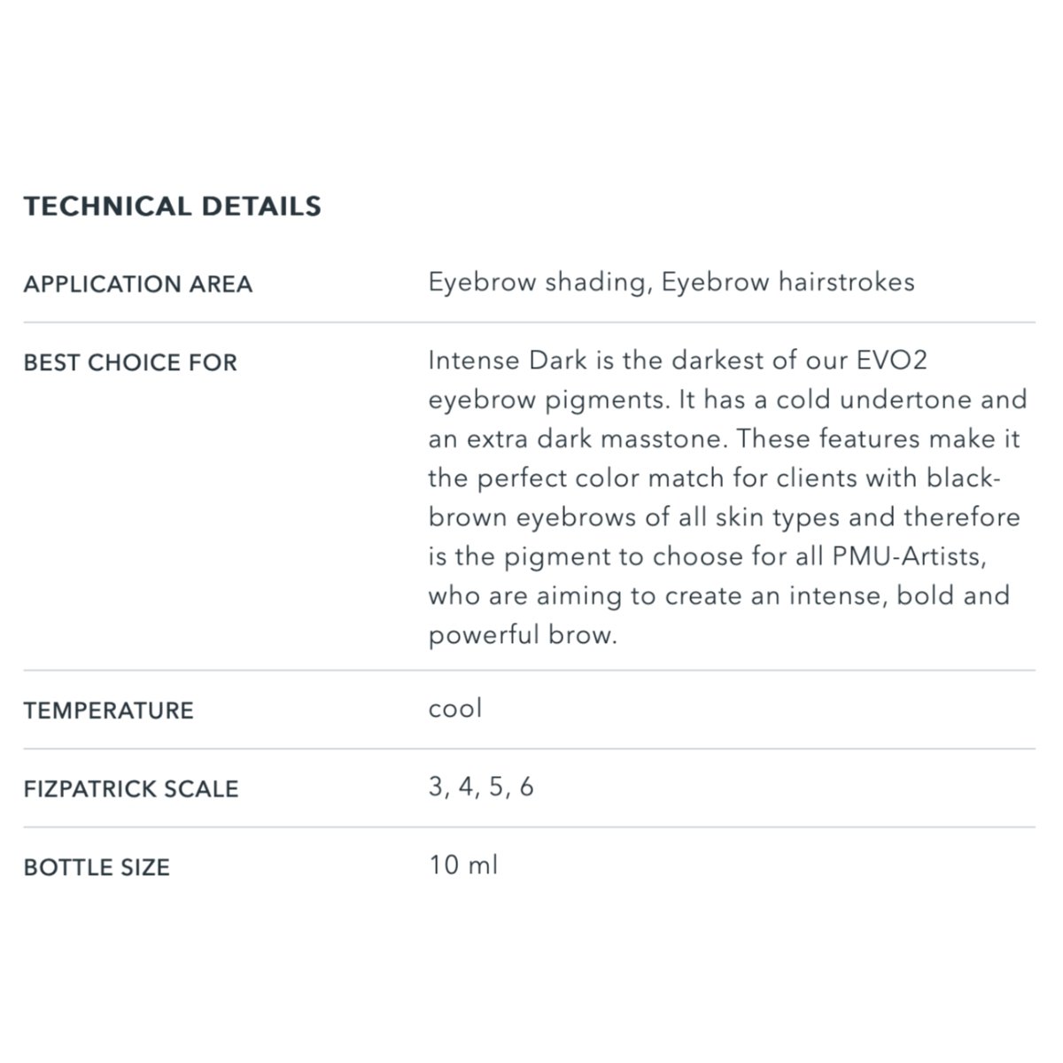 Pigment Intense Dark - AMIEA EVO 2 jest idealnym wyborem dla technik makijażu permanentnego brwi, takich jak metoda pudrowa, cieniowanie czy włoskowa. Może być stosowany samodzielnie dla uzyskania intensywnego efektu lub mieszany z jaśniejszymi pigmentami w celu dopasowania do indywidualnych potrzeb klientki. Przed aplikacją należy dobrze wstrząsnąć buteleczkę, a po użyciu szczelnie zamknąć pigment, aby zachować jego najwyższą jakość.